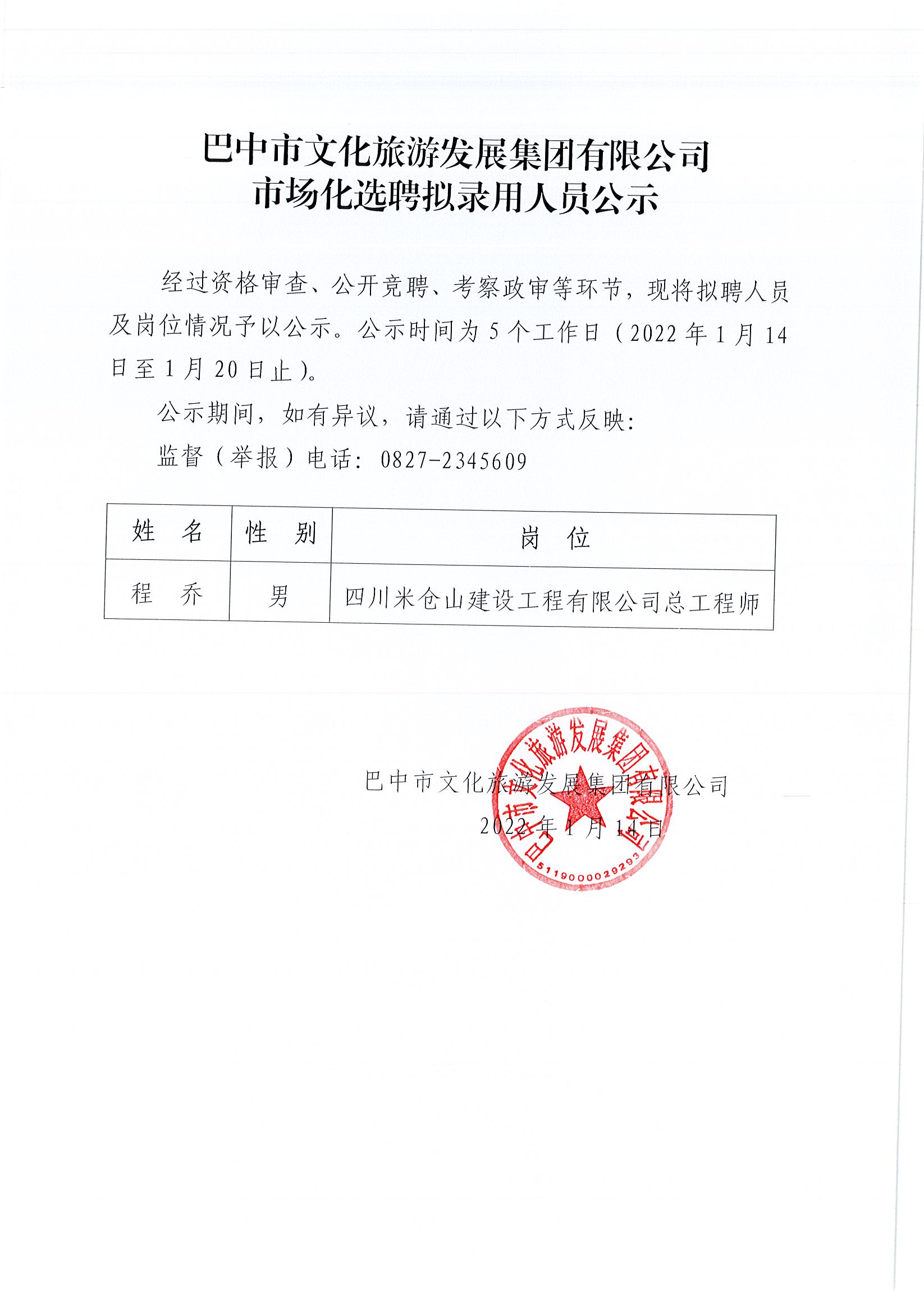 巴中市文化旅游發(fā)展集團(tuán)有限公司市場化選聘擬錄用人員公示