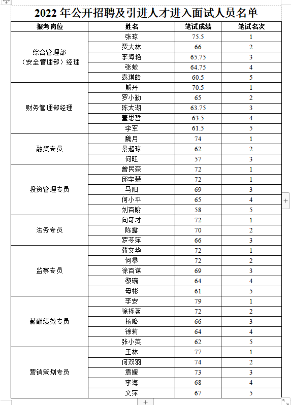 (一)面試人員名單:按照筆試成績(jī)前5名的人員(筆試考試參考人數(shù)未達(dá)到5人的,全部進(jìn)入面試)確定36名考生進(jìn)入面試。(進(jìn)入面試人員名單見(jiàn)附件)
