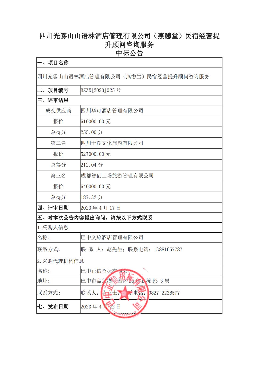 四川光霧山山語林酒店管理有限公司(燕憩堂)民宿經(jīng)營提升顧問咨詢服務(wù)中標(biāo)公告