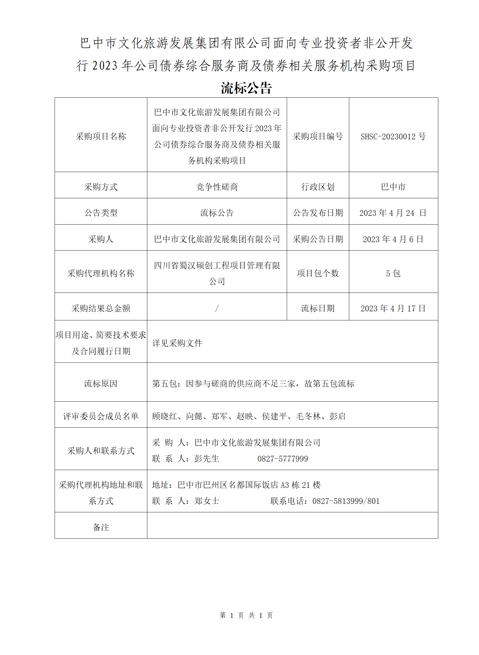 巴中市文化旅游發(fā)展集團(tuán)有限公司面向?qū)I(yè)投資者非公開發(fā)行2023年公司債券綜合服務(wù)商及債券相關(guān)服務(wù)機(jī)構(gòu)采購項(xiàng)目流標(biāo)公告