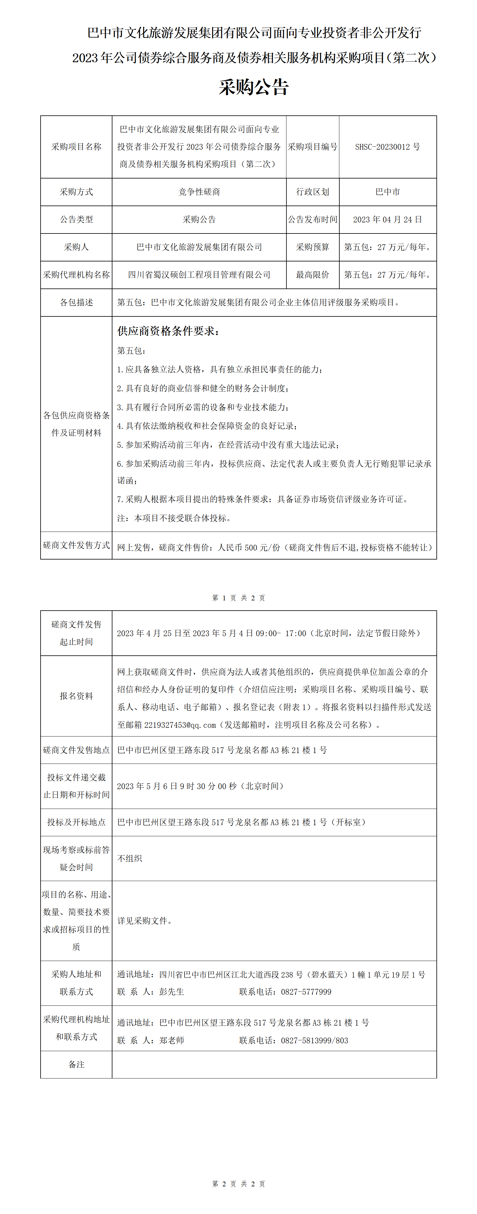 巴中市文化旅游發(fā)展集團有限公司面向專業(yè)投資者非公開發(fā)行 2023年公司債券綜合服務商及債券相關服務機構采購項目(第二次) 采購公告