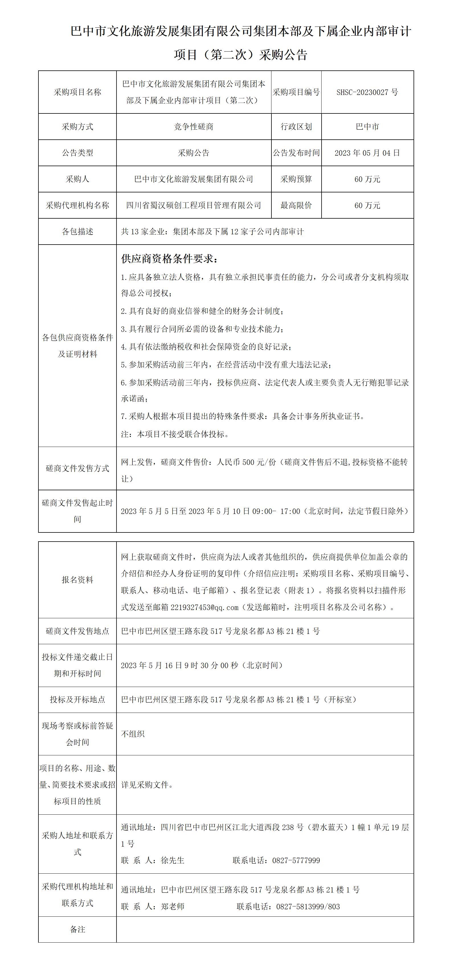 巴中市文化旅游發(fā)展集團(tuán)有限公司集團(tuán)本部及下屬企業(yè)內(nèi)部審計(jì)項(xiàng)目(第二次)采購公告