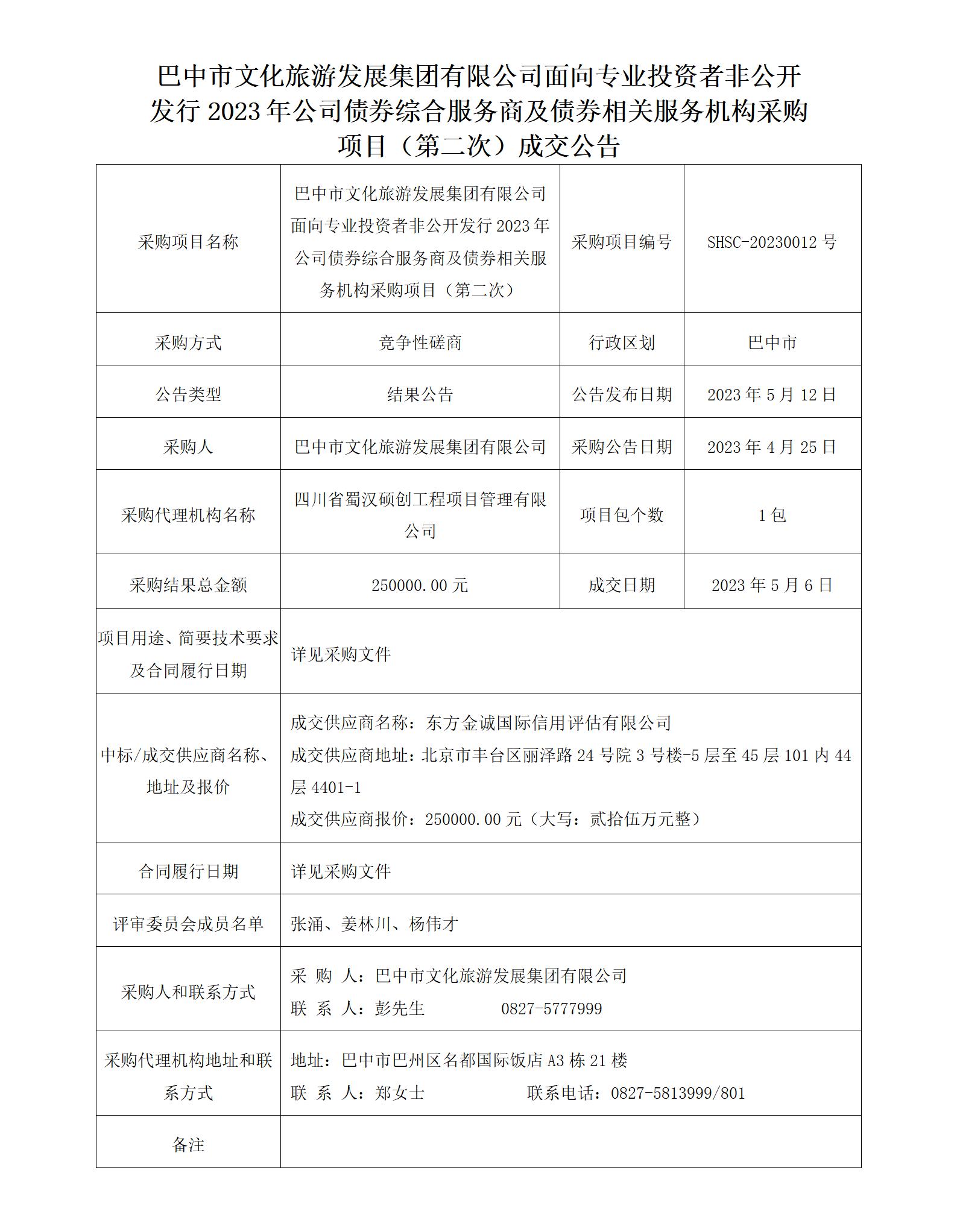 巴中市文化旅游發(fā)展集團有限公司面向專業(yè)投資者非公開發(fā)行2023年公司債券綜合服務商及債券相關服務機構采購項目(第二次)成交公告