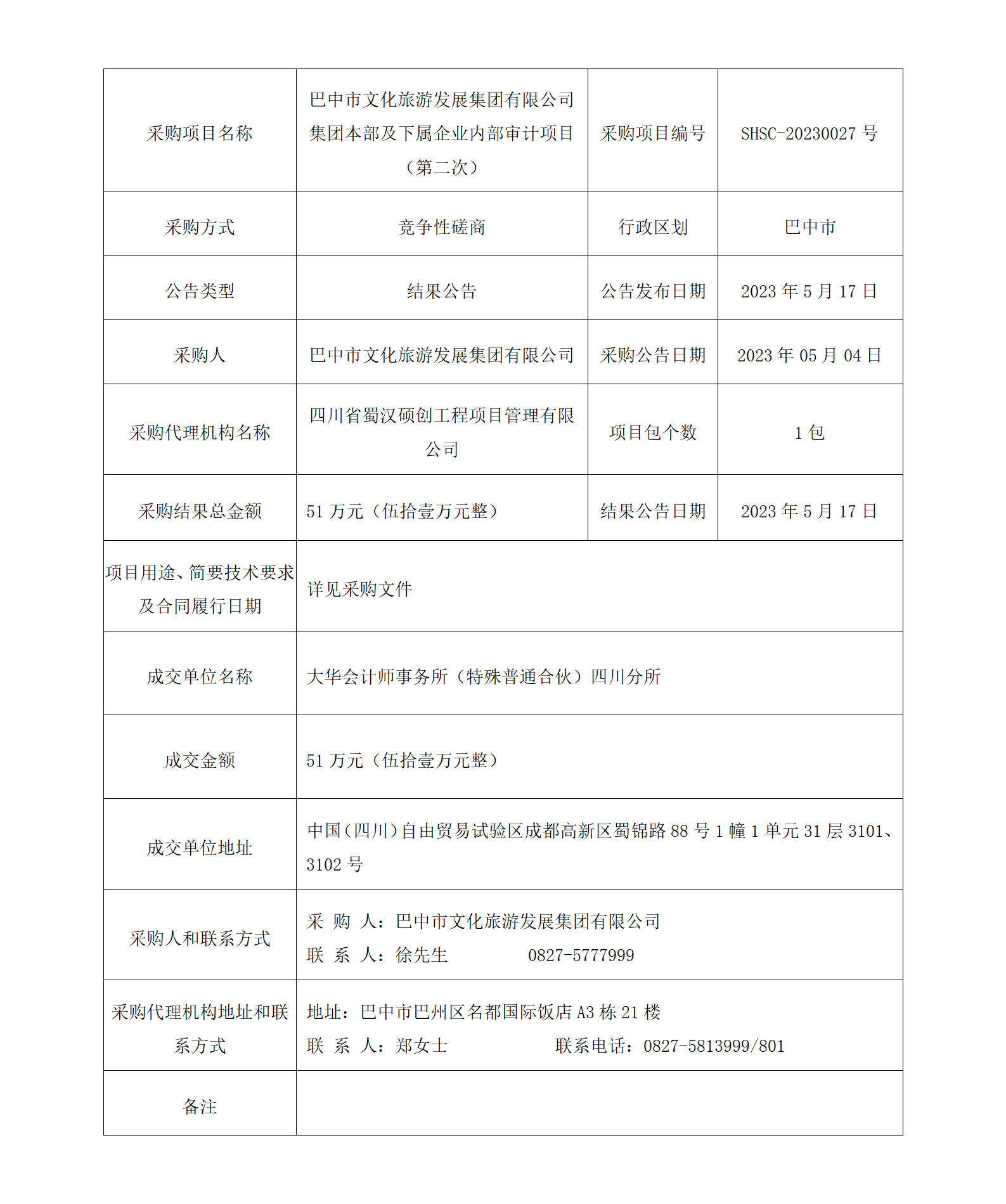 巴中市文化旅游發(fā)展集團(tuán)有限公司集團(tuán)本部及下屬企業(yè)內(nèi)部審計(jì)項(xiàng)目(第二次)成交結(jié)果公告