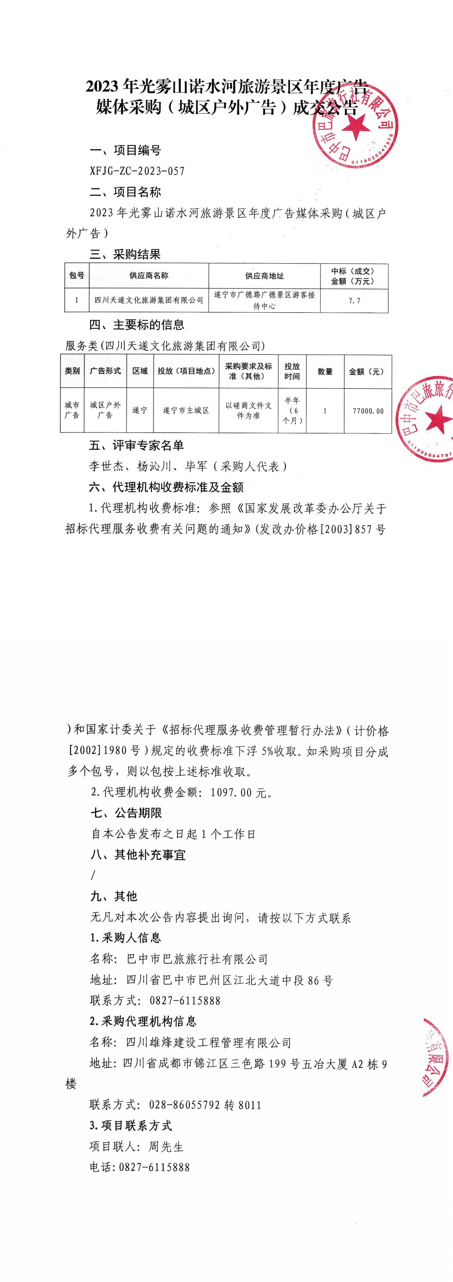 巴中市巴旅旅行社有限公司2023年光霧山諾水河旅游景區(qū)年度廣告媒體采購(gòu)競(jìng)爭(zhēng)性磋商公告(城區(qū)戶外廣告)成交公告